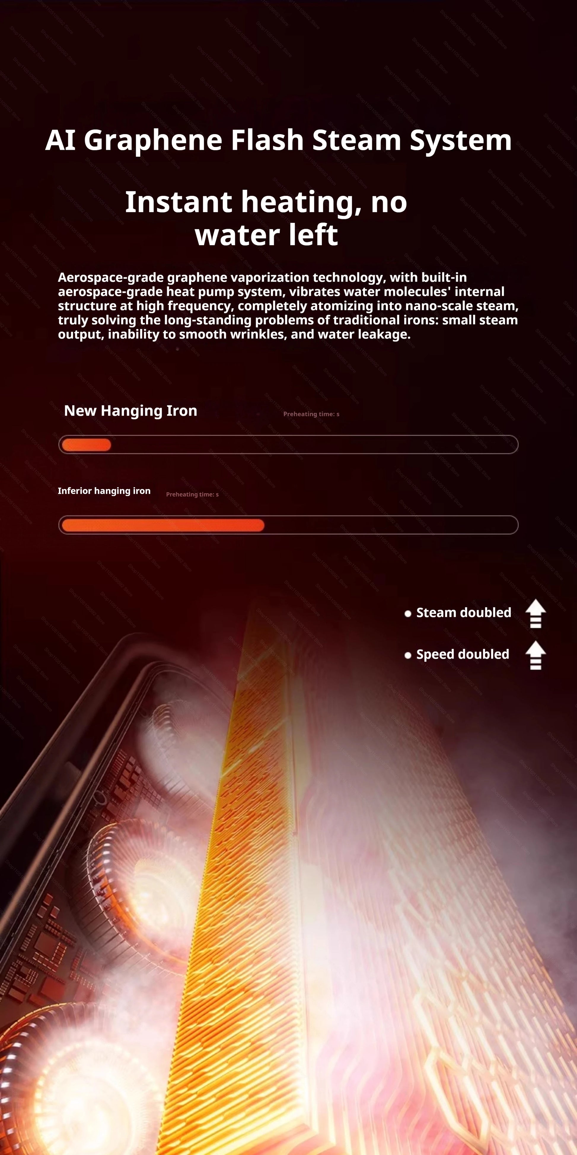 Heats up in 20 seconds to blast continuous steam for vertical steaming on suits, dresses, shirts, and fabrics without water spitting.