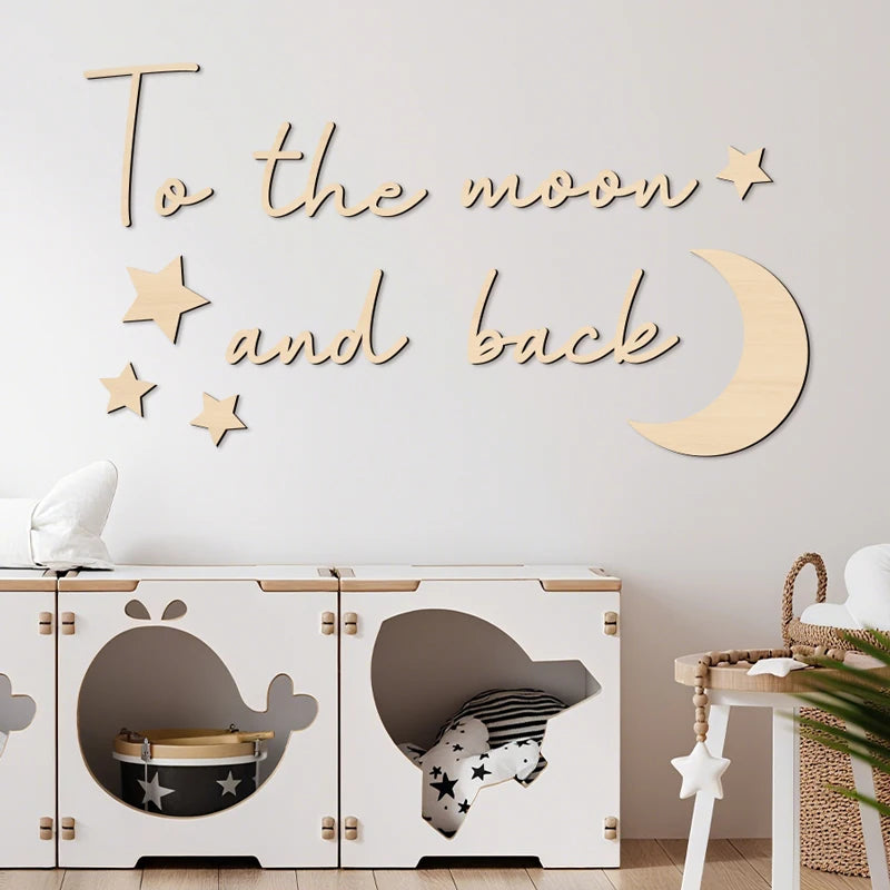 Envelop your spaces in celestial poetry with these Boho Style Wooden Wall Stickers. "To The Moon and Back" adorned with moon and stars infuses timeless bohemian elegance into bedrooms or living rooms.