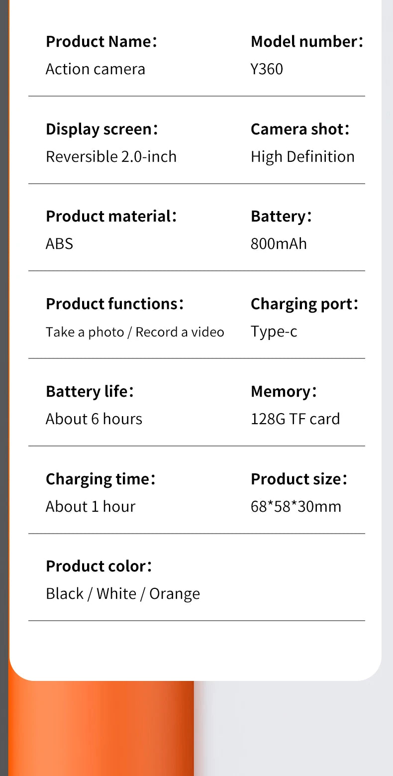 Flip Clear Screen: 1.3-2" rotatable display for easy self-recording and framing.
